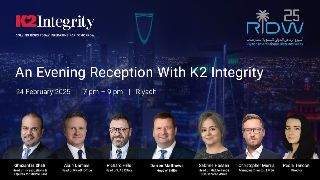 K2 Integrity hosted an exclusive reception on 24 February during Riyadh International Disputes Week, bringing together top industry professionals for an evening of meaningful connections.